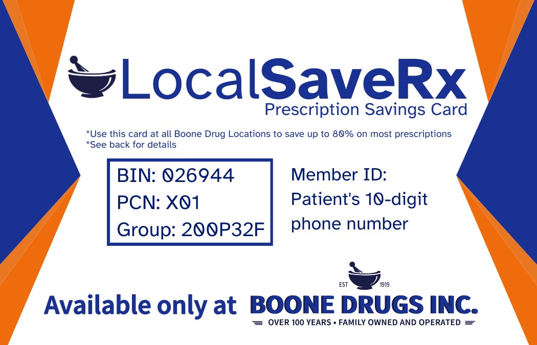 You can pick up a LocalSaveRx card at any Boone Drug location, local health clinics, community centers, and local businesses.